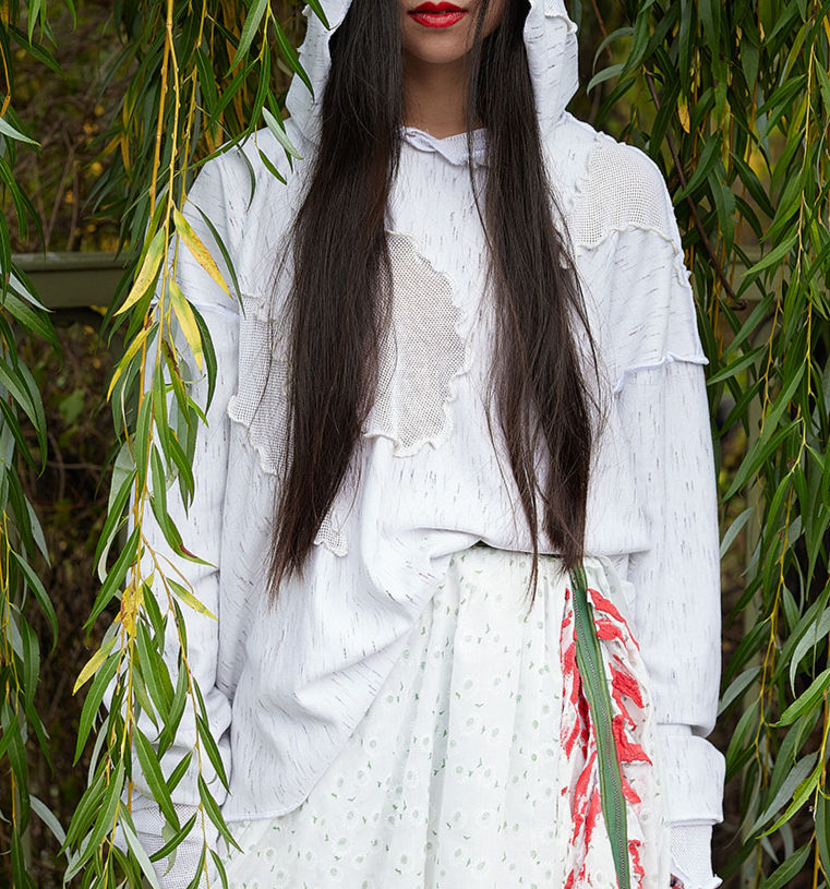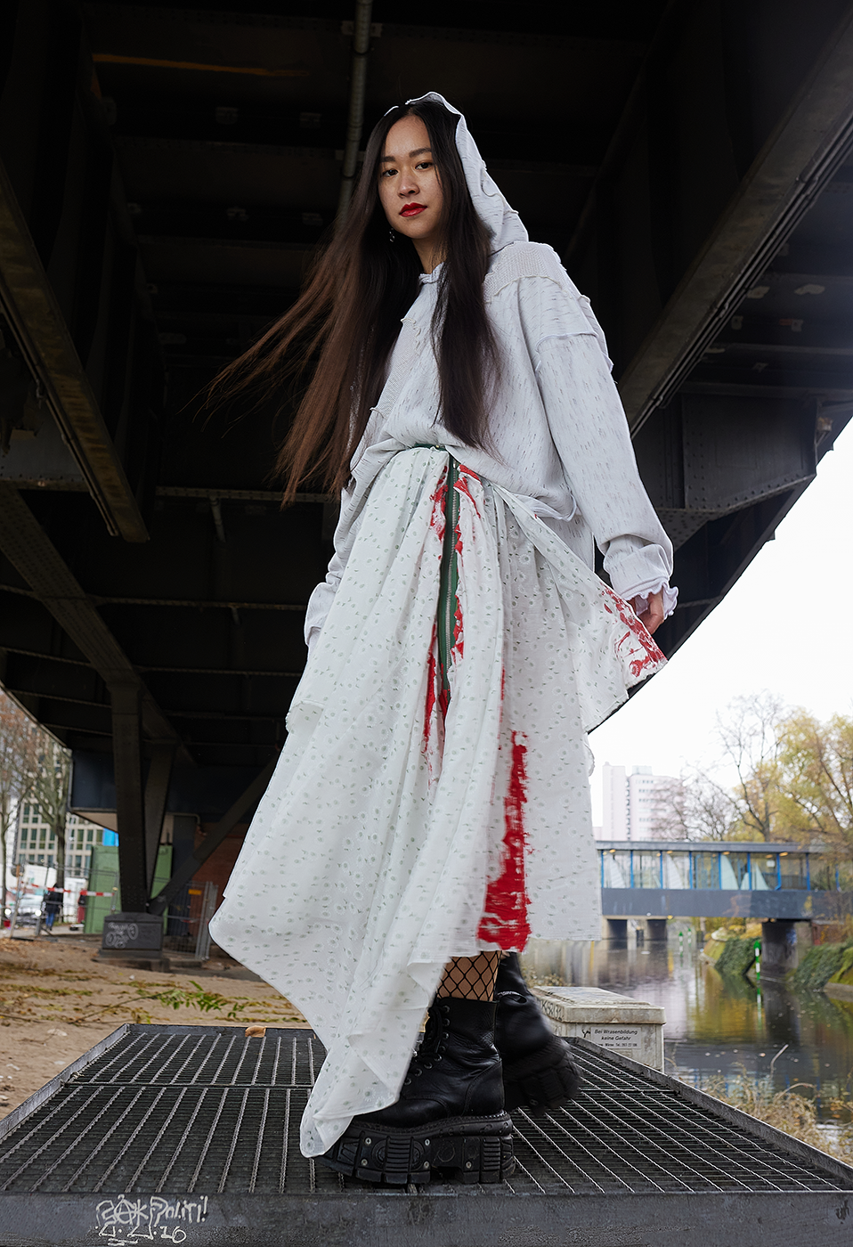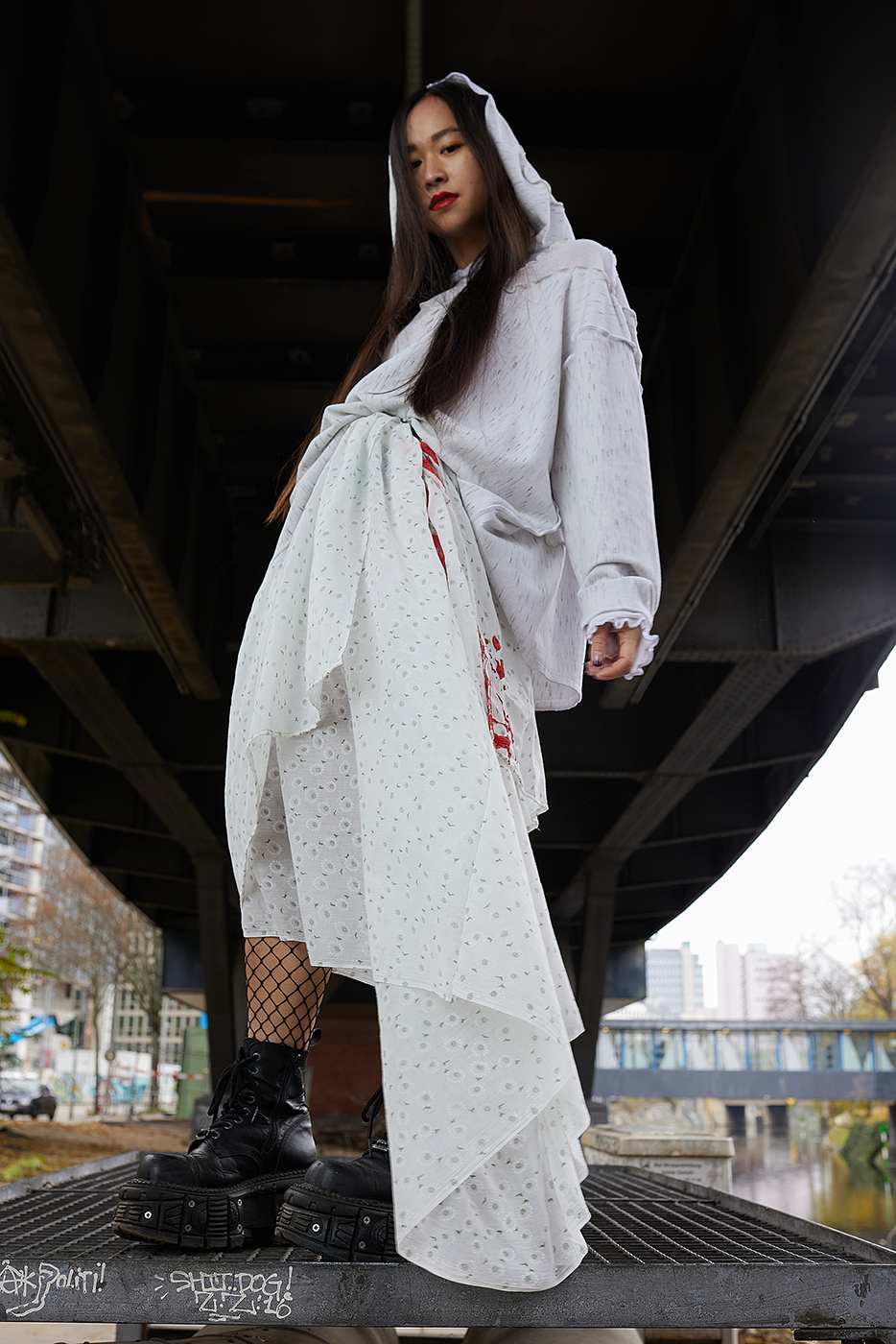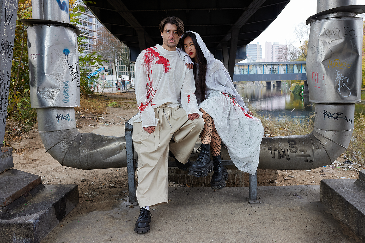 "Die Blumen von Gestern" it's a playful and dark exploration. Floral prints intertwine with bold red & black strokes, capturing the growing pains of a creative in a city that breathes volatility.
